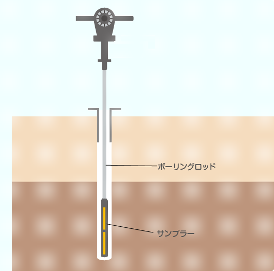 具体的には、サンプラーを小型動力ハンマーで調査深度まで地中に打ち込んだ後、それを引き抜くことにより地層サンプルを採取する技術で、土壌汚染調査のために開発されました。