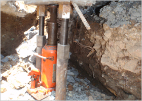 この時、建物の傾斜が水平に戻るため、外周に埋設してあった配管が障害になりますので配管を切ります。よって、ジャッキアップ中は生活用水は使用できなくなります。(約4~6時間程)