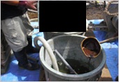 エアーミルクの注入作業 (1)各支持台毎に設置したエアーミルクを注入し、支持台を固定する。 (2)ジャッキアップした為に生じた基礎下の空隙にエアーミルクを注入する。 |