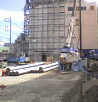 メーカーで製造された杭を杭打機で支持層まで削孔し、埋設する工事です。従来の工事より低騒音、低振動による施工が可能。